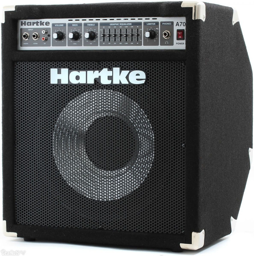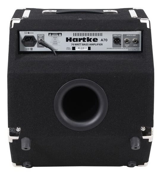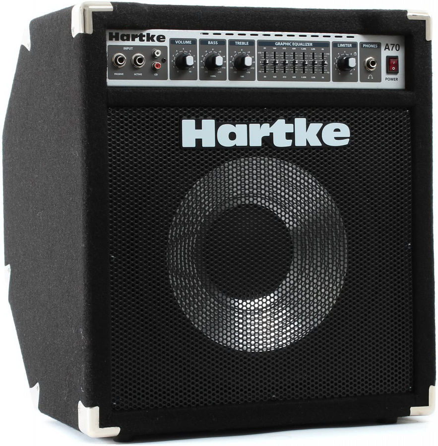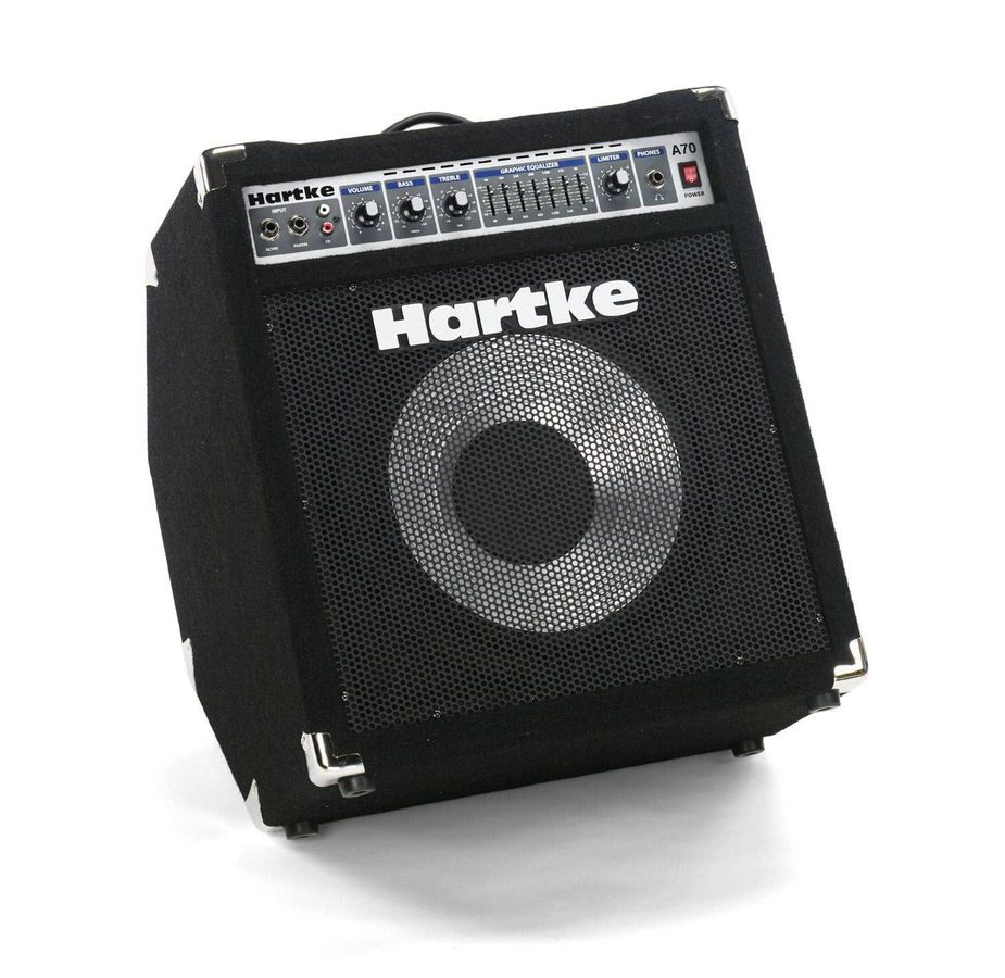 Hartke А70 – мощный басовый комбо усилитель, в котором используется 12-дюймовый драйвер с алюминиевым диффузором, с конструкцией корпуса, позволяющей использовать его как в прямом положении, так и в наклонном (для увеличения ясности и рассеивания звука).