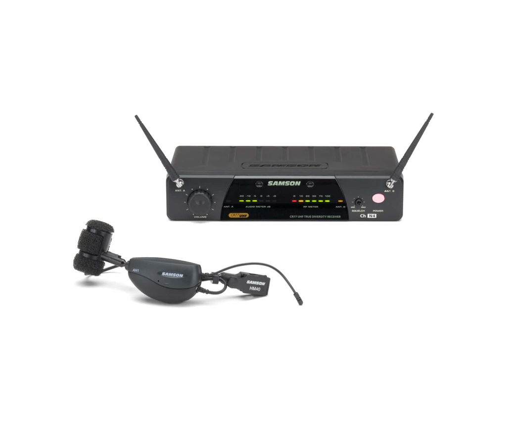 Беспроводная UHF-система для духовых инструментов Samson AirLine 77 Wind предлагает использование без поясных передатчиков или проводов, только свобода передвижения и мобильность. Система состоит из передатчика Samson AH1 с вмонтированным конденсаторным микрофоном Samson HM40 и приемником Samson CR77.