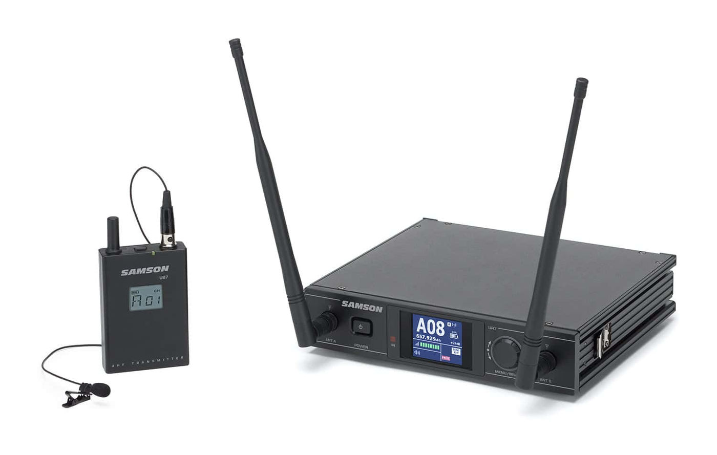 Прочная конструкция ручного передатчика Samson UB7 надежно защищает микрофон от внешних воздействий. Популярный петличный микрофон стал индустриальным стандартом и признан одним из лучших на рынке. Яркий и читаемый ЖК дисплей поясного передатчика, позволет контролировать уровень заряда батареи, частоту, уровень сигнала.