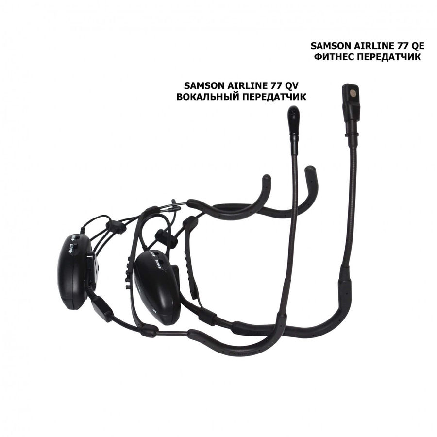Передатчики Samson AirLine оснащены гарнитурами Samson Qe Fitness или QV10e Vocal. Samson Qe и Samson QV10e — гарнитуры, располагающиеся на затылке. Передатчик крепится непосредственно на головной гарнитуре, не имеет проводов, что очень удобно и безопасно во время выступлений или групповых занятий фитнесом.