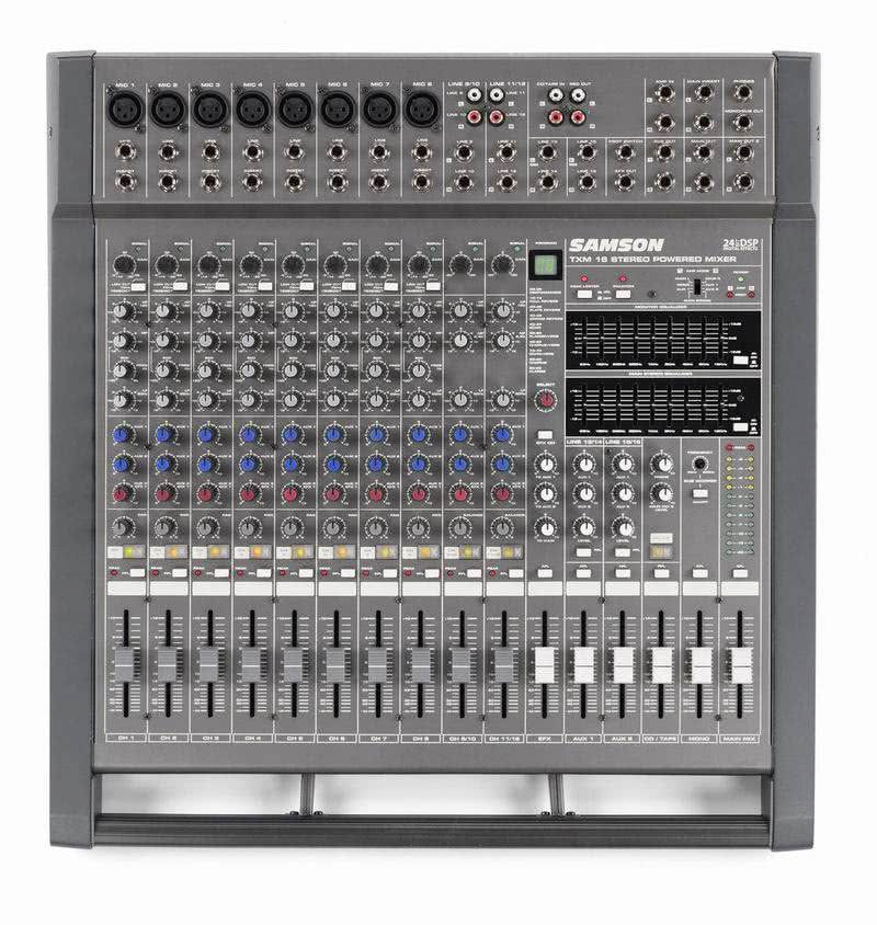 Samson TXM16 мощный микшерный пульт-усилитель студийного качества, для живых выступлений. TXM16 имеет 16 каналов с мощными усилителями 2х500 ватт или 1000 ватт в мостовом режиме.