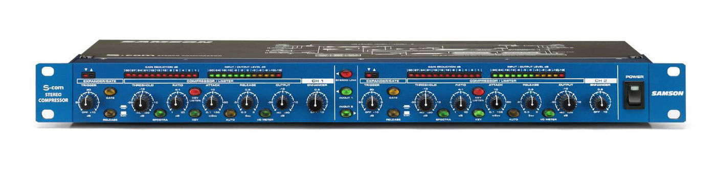 Samson S com двухканальный процессор компрессор, занимает 1U в 19" стойке, разработан для компрессирования сигнала во множестве различных применений. Samson S-com разработан для простого и понятного управления.