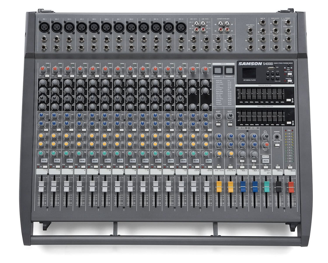 Samson S4000 предлагает общую мощность 1000 ватт (500 ватт в каждом канале при 4 омах сопротивления акустических систем) с 20 входными каналами, включая 12 моно каналов с высококачественными микрофонными предусилителями и линейными входами, а также четыре стерео канала. В прибор встроен двухканальный 24-битный процессор эффектов с 100 заданными параметрами и ручками управления уровнем FX, а также встроенным MP3-плеером / рекордером для воспроизведения Ваших музыкальных файлов через Вашу звуковую систему или запись Вашего исполнения музыки на носитель подключаемый к разъему USB (флэшки памяти).