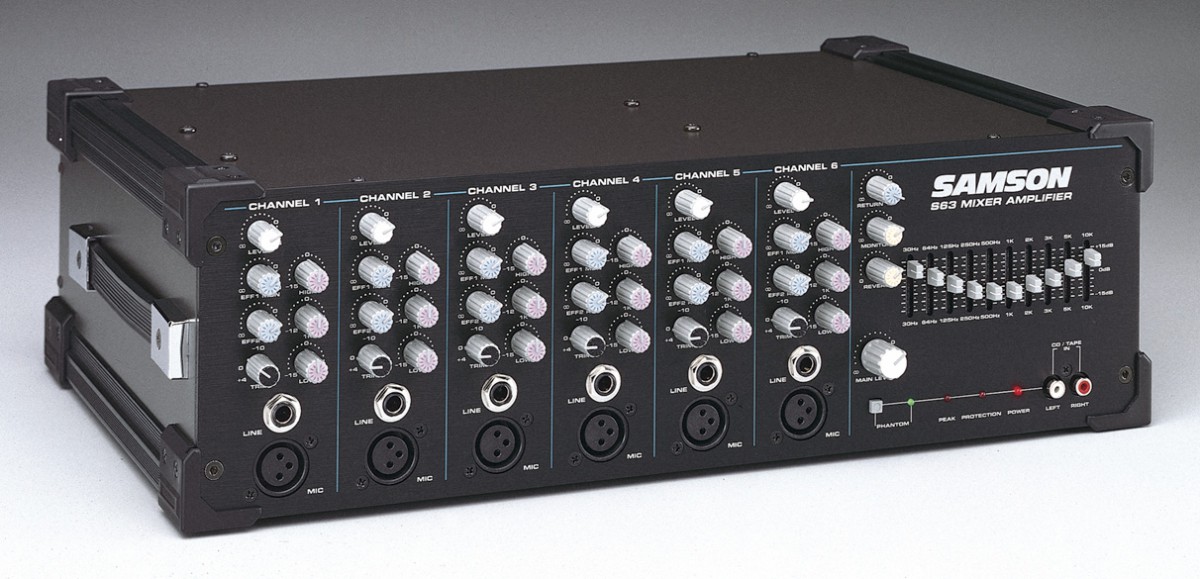 S63 микшер-усилитель, 6 входов, 200Вт/4 Ом, 130Вт/8 ом, диапазон 10 гц -28 кгц, 3х полосный эквалайзер, динамический диапазон 110dB, размеры 480х125х280, вес 13 кг