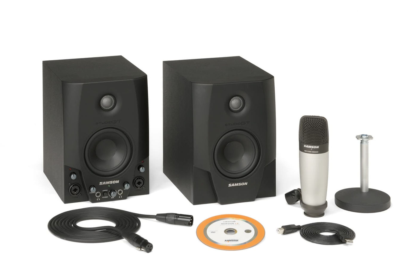 С мониторами Samson Studio GT Pro, вы получаете готовую студию звукозаписи на своем компьютере. В комплект поставки входят пара студийных мониторов Studio GT с аудиоинтерфейсом USB, конденсаторный студийный микрофон C01 и программное обеспечение Cakewalk® Sonar LE. Необходимые аксессуары дополняют поставку: USB-кабель, микрофонный кабель с разъемами XLR и ветрозащита для микрофона. Никогда не было легче создать профессиональную студию записи на Вашем компьютере.