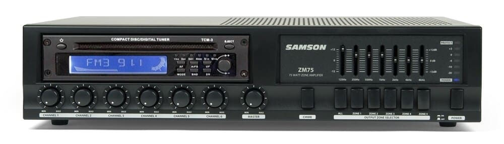 ZM75(TCM3) зонный микшер-усилитель 6 входов (4 микроф,2 лин), с модулем источником музыкальных программ TCM-3, 5 зон, 75 Вт/4 Ом/100в,7 полос графический экв-р, 420х343х88 мм, вес 9,8 кг, бренд Samson