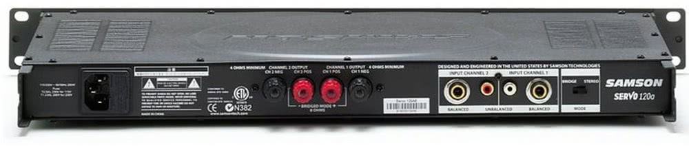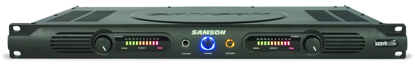 Samson Servo 120A 1U стерео усилитель обеспечивает 60 Вт мощности на канал при 4 Ом или 120 Вт на 8 Ом в мостовом режиме. Интуитивно понятная передняя панель с органами управления и индикации, которые включают выключатель питания, независимый контроль уровня входного сигнала левого и правого каналов, 10-сегментные светодиодные индикаторы, светодиод защиты, удобный разъем для наушников и режим включения / выключения акустических систем для персонального мониторинга.