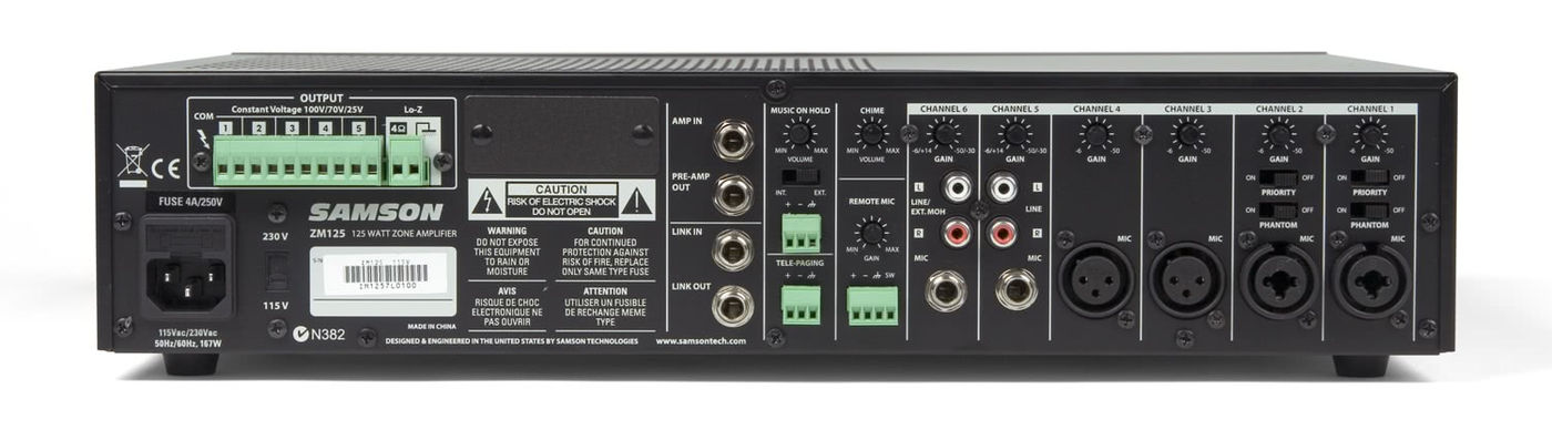 Samson ZM125 идеально подходит для трансляции музыки и объявлений в различных помещениях, а отдельный микрофонный вход позволяет подключить удаленную пейджинговую станцию (для администрации в ресторане, например).